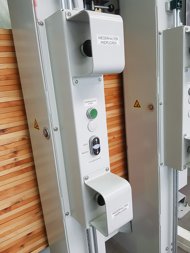 The longitudinally displaceable beams with height-adjustable press cylinders enable optimum adaptation of the block gluing press to the workpiece. The side press clamps are available in various designs to ensure optimum fixation and are adapted to the intended use. Stepped or rounded shapes can thus be produced easily, safely and quickly, even with high pressing forces.