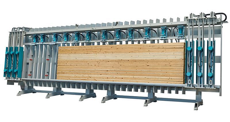 Die solide Grundkonstruktion mit durchgehender Auflage, kräftigen Presszylindern und starken Niederhaltern sorgt für höchste Qualität der Leimfuge. Ergonomisch günstig angebaute Rollenbahnen mit integrierter Leimangabe erhöhen Leistung und Bedienkomfort. Durch die seitlich verschiebbaren Presszylinder ist eine optimale Ausnutzung der Pressfeldlänge bzw. Anpassung der Druckverteilung an die Pressgutlänge möglich.